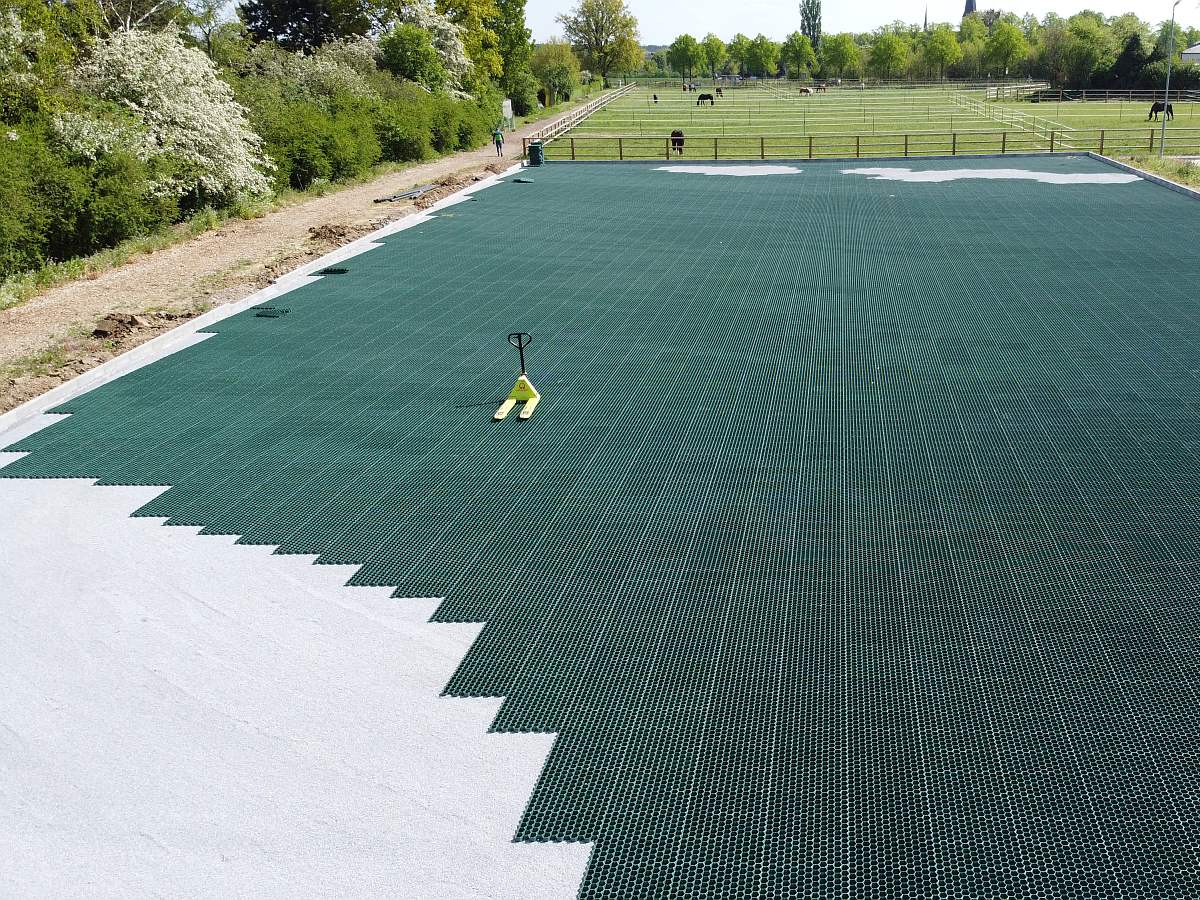 Das Equiground-Trennschichtsystem verteilt die Punktbelastung der Hufe durch die stabile Gitterstruktur großflächig und verhindert das Vermischen und Verdichten von Tretschicht und Unterbau. Der Boden bleibt wasserdurchlässig. Equiground wird aus hochwertigem und schlagzähem Kunststoff (PP) hergestellt. Equiground ist zu 100% recyclingfähig und grundwasserneutral. Die Vorteile: Die Verlegung kann in Eigenleistung erfolgen, leichtes Handling, hohe Schlagfestigkeit bei geringer Tretschichtauflage, gute Wasserführung, umweltverträglicher Recycling-Kunststoff (HDPE-PP), keine Entsorgungsprobleme.