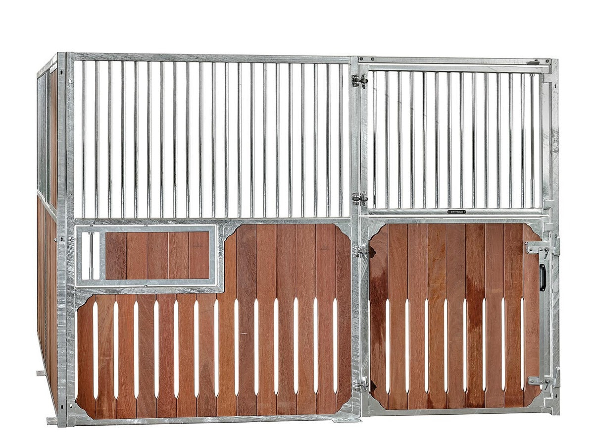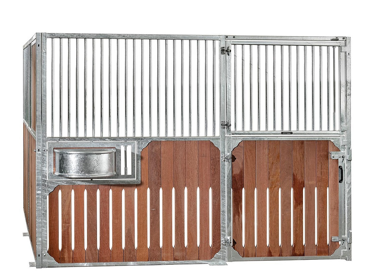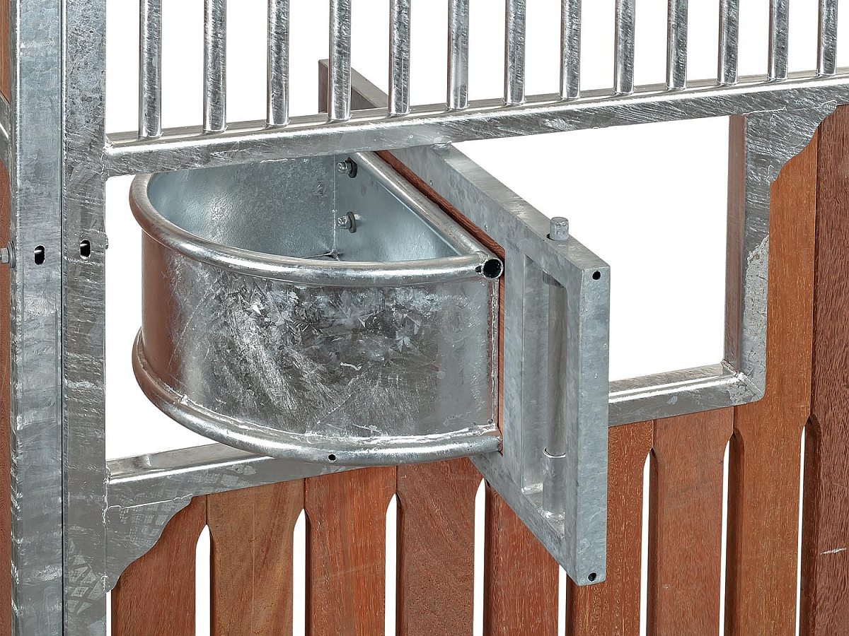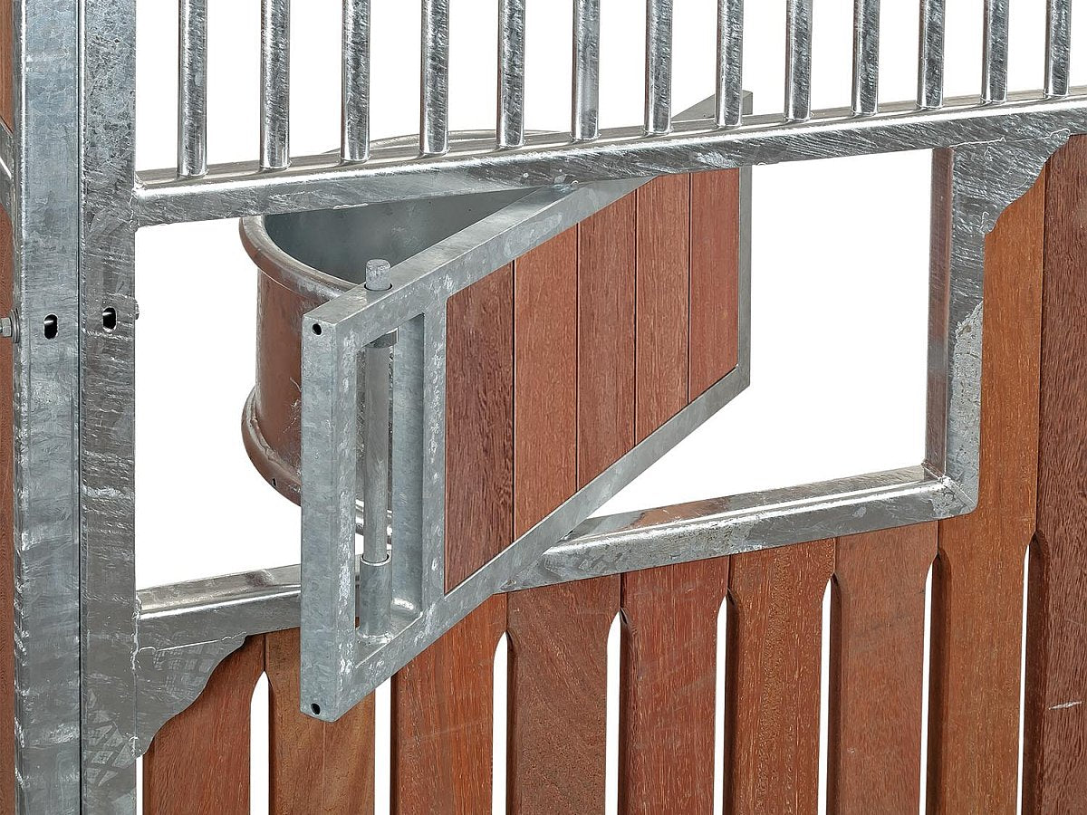 Die Drehtrogvorrichtung ermöglicht das Herausschwenken der Futtertröge auf die Stallgasse, um diese von der Stallgasse aus zu befüllen. Nur in Verbindung mit der Fertigung von Boxenwänden möglich, keine nachträgliche Installation.