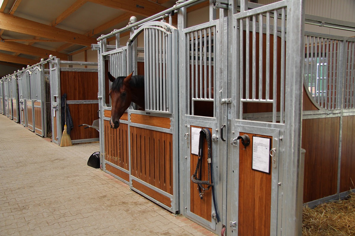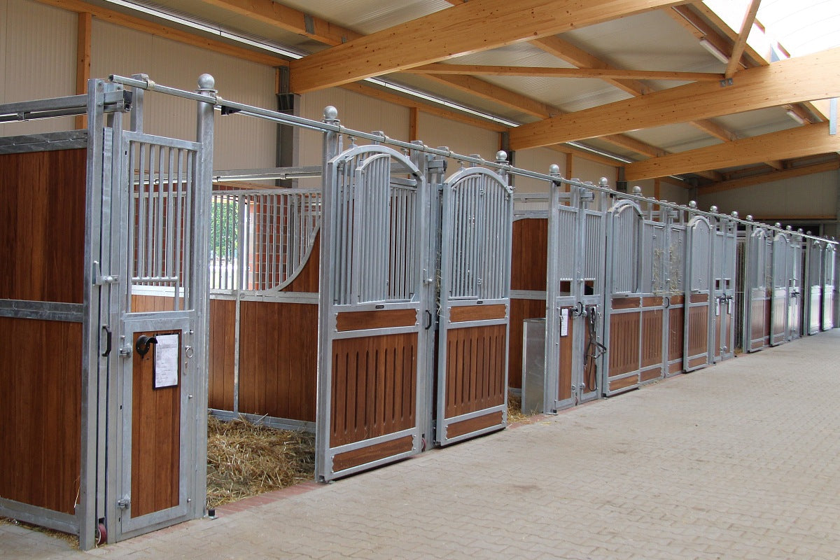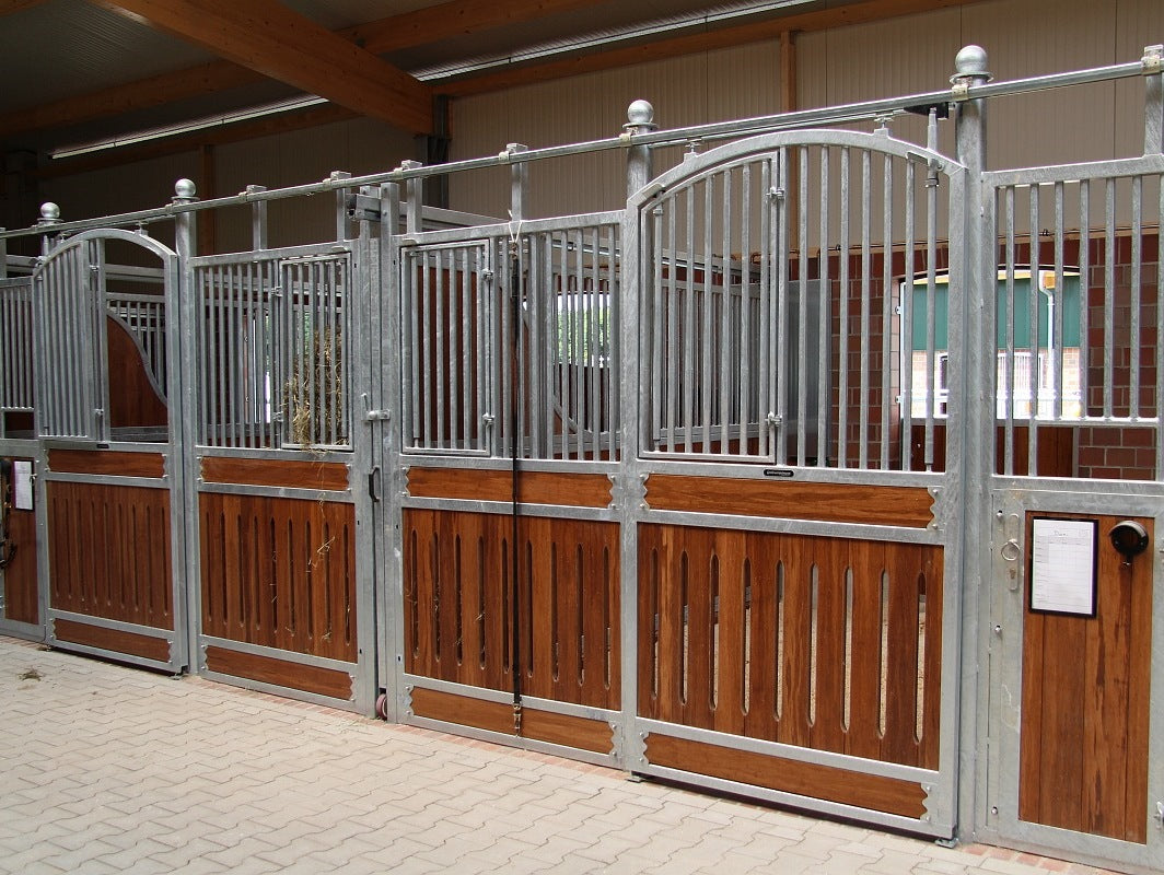 Die Pferdebox Nando besteht aus einer geschwungenen Frontwand mit Futterdurchreiche und Schiebetür. Die mit Hochbogen ausgeführte Schiebetür wird in einer C-Schiene mit kugelgelagertem Laufwagen bewegt. Die Schiebetür wird durch den bewährten Federstabverschluss arretiert.