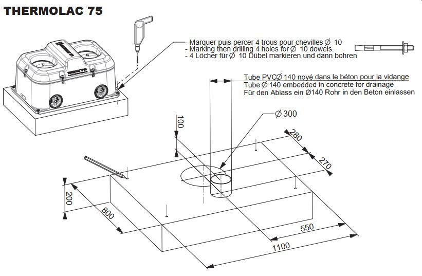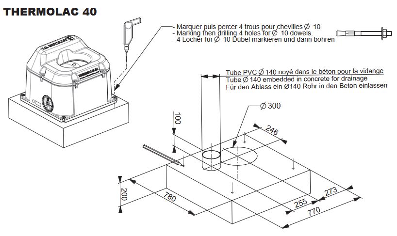 • Die Balltränke sollte, leicht erhöht, auf einer ca. 15 cm dicken Betonplatte befestigt werden, die auf jeder Seite ca. 30 cm größer als die Tränke selbst sein muss