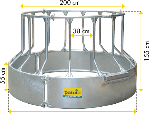 Die Futtersparraufe von PATURA sorgt durch die spezielle Anordnung der Fressgitter für ein Minimum an Futterverlusten bei der Weidefütterung. Herunterfallendes Futter fällt in den Innenbereich der Raufe, sodass Trittverluste vermieden werden. Es entstehen bis zu 75 % weniger Futterverluste im Vergleich zu herkömmlichen Rundraufen. Durch ihre massive Bauweise und die vierfache Stabilisierung der Fressgitterrohre ist die Futtersparraufe bestens für die Rinderhaltung geeignet.