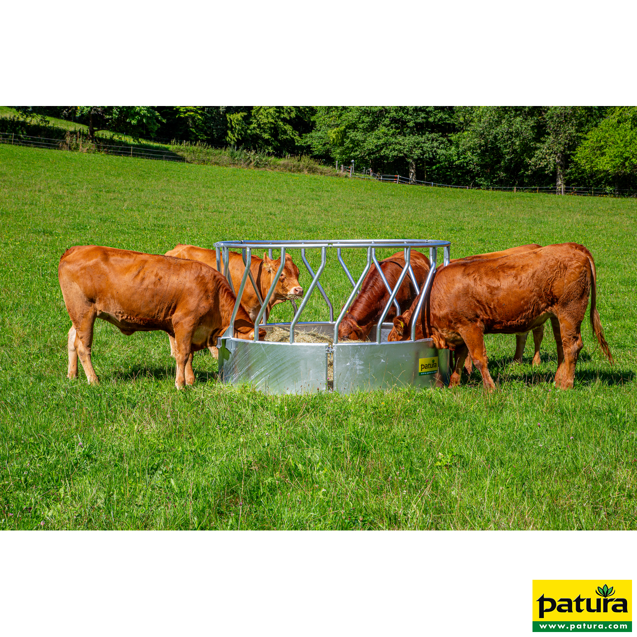 Die kreisförmige, aus 3 Segmenten bestehende Rundraufe ermöglicht durch die runde Bauweise ein gleichzeitiges Fressen von Tieren unterschiedlichen Ranges. Die Raufe ist komplett mit dem Schlepper über die Dreipunktanhängung transportierbar. Die Befüllung erfolgt von oben mit dem Frontlader oder auch durch Öffnen eines Segmentes und Einrollen des Ballens mit der Hand.