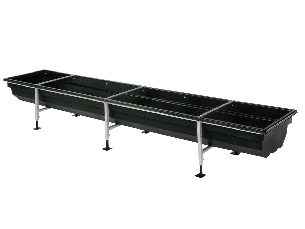 Futtertröge aus PE mit verstellbarem Stahlgestell 85 cm breit, schwarz 500 cm lang, 6 Füsse, Höhenverstellbar von 55 cm - 80 cm