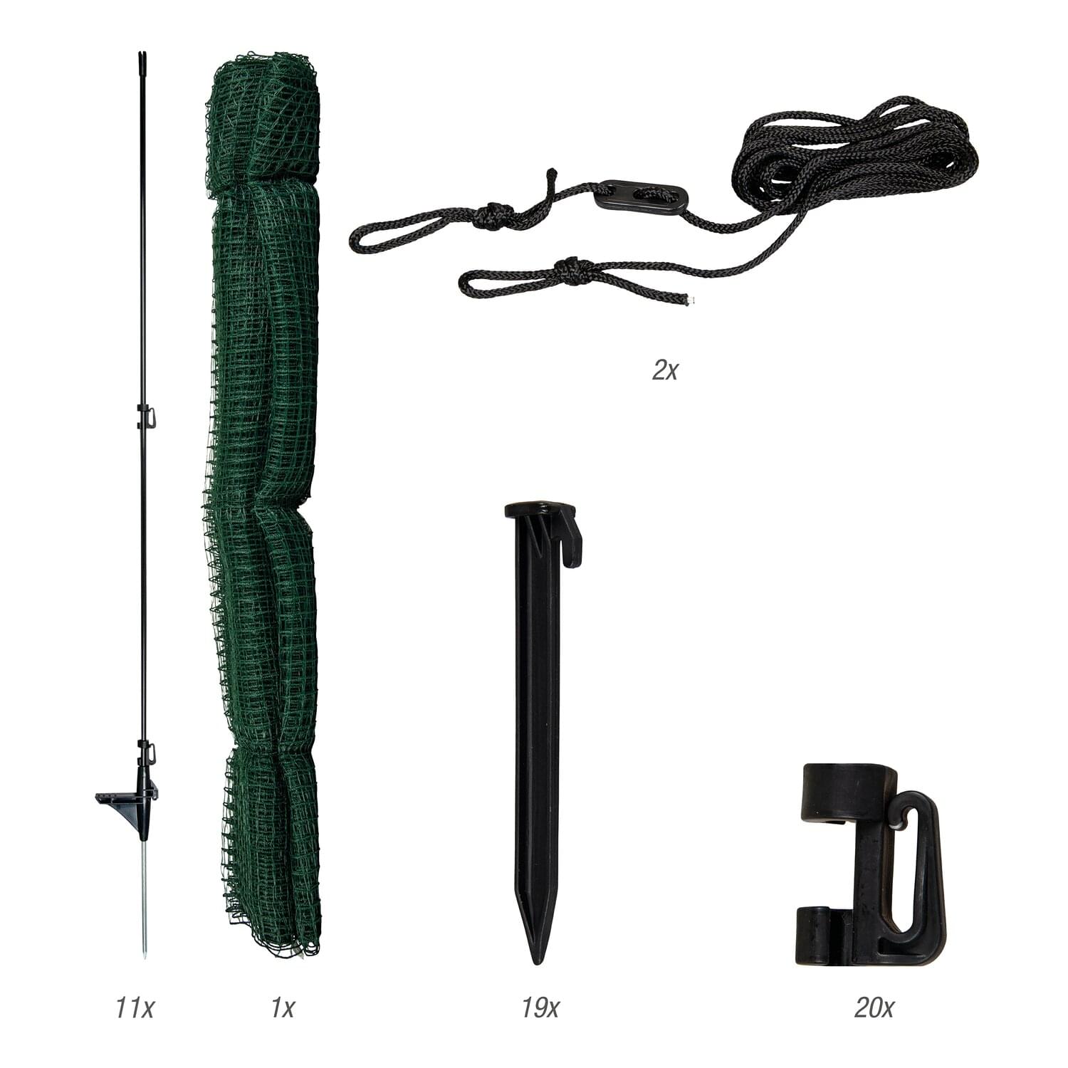 Dank dem integrierten Tritt kann man die Fiberglaspfähle leicht in den Boden stecken. Die Einzelspitze garantiert einen stabilen Stand - nach kurzem Aufbau steht der Zaun fest und sicher! Um das Netz auf die gewünschte Spannung zu bringen, kann man an den Pfählen mit Isolatoren Spannseile anbringen und diese nach Belieben straff ziehen. Die 19 kleinen Heringe lassen sich schnell und einfach in den Boden drücken, halten das Netz fest am Boden und hindern Ihre Tiere daran, das Netz mit der Schnauze hochzuschieben und auszubüxen.
