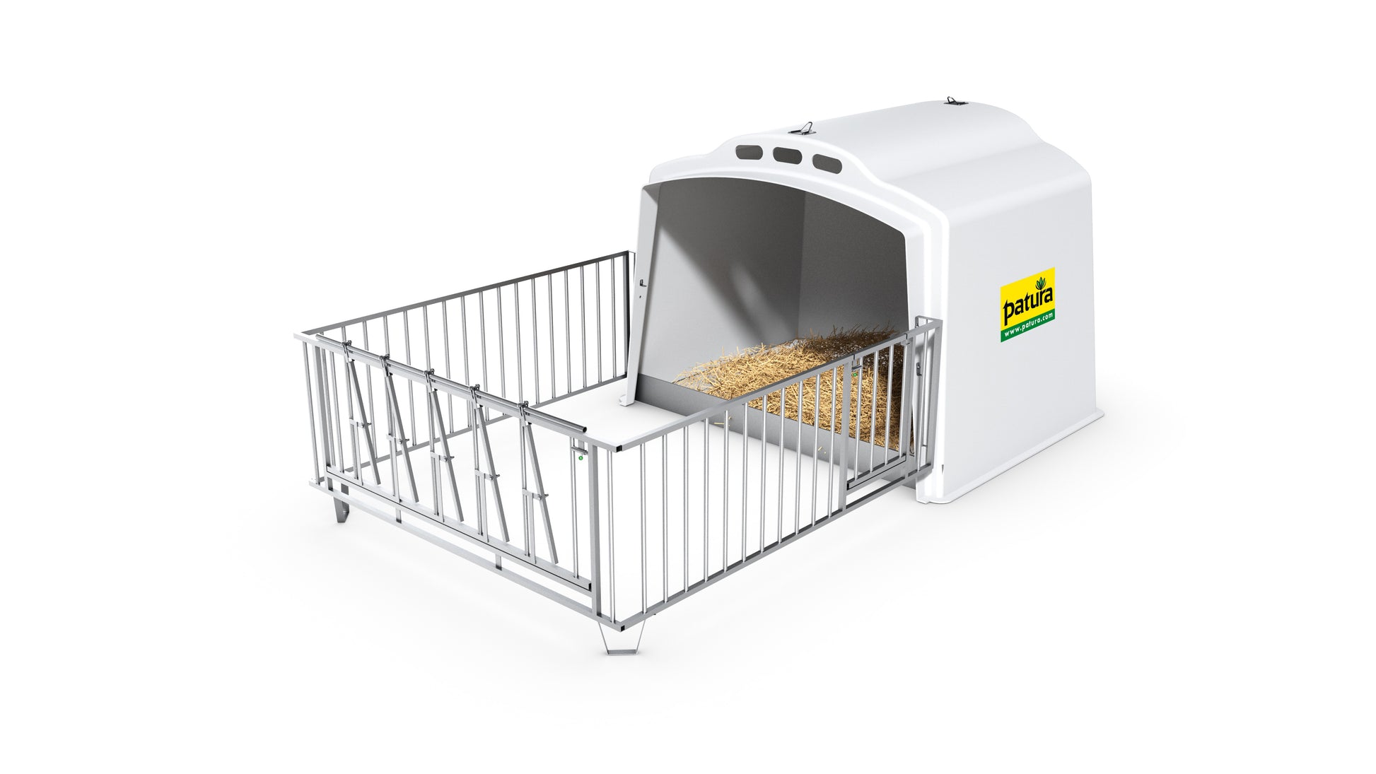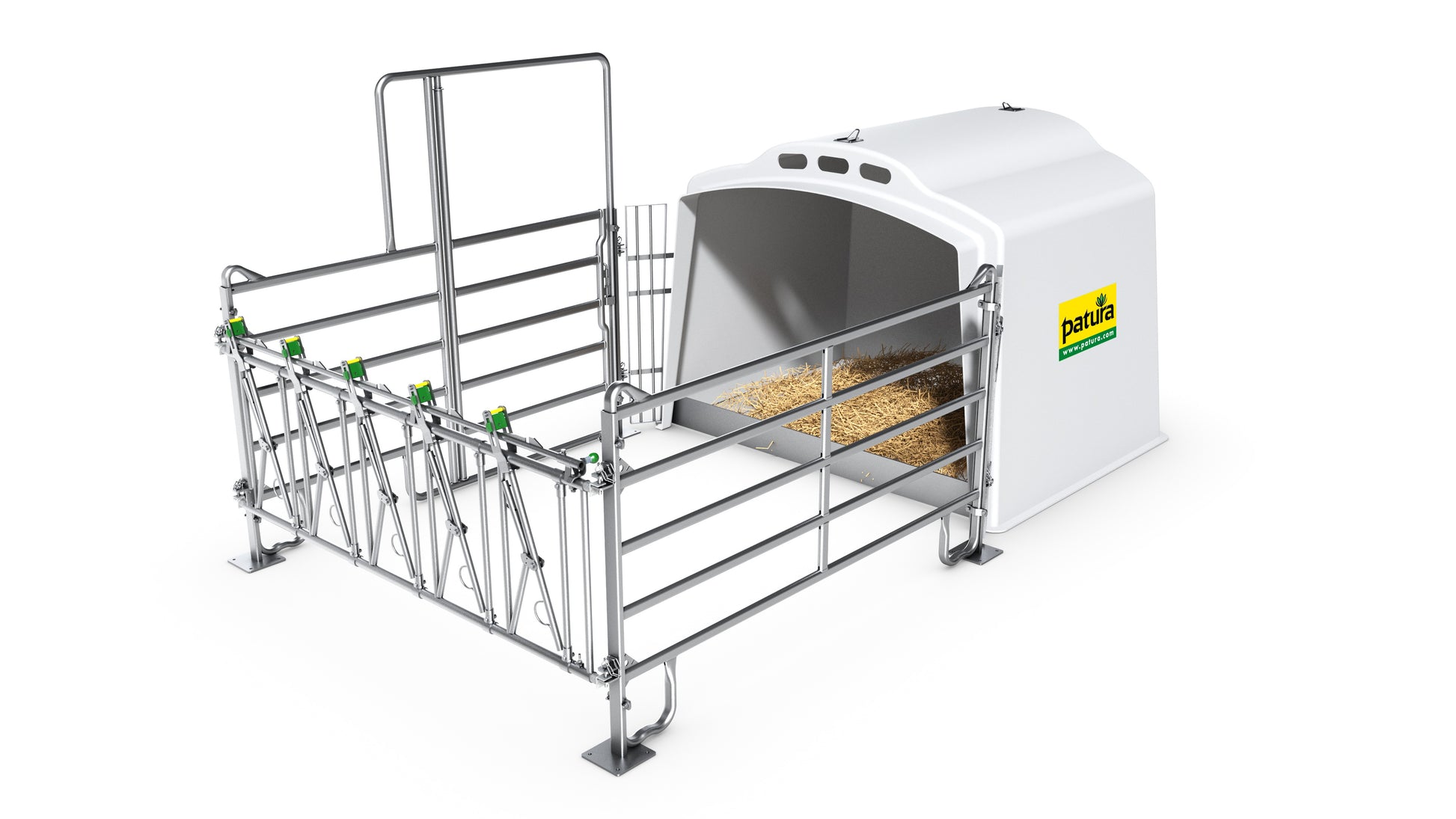 Als Erweiterung für die Kälberhütte kann an alle Varianten der PATURA Kälberhütten eine Umzäunung angebaut werden. Diese Umzäunung verfügt je nach Ausführung über zwei seitliche Abtrennungen inklusive Zugangstür sowie einem Fressgitter mit mindestens 5 Fressplätzen, an dem ein Futtertrog sowie ein Nuckeleimer-Montagesatz angebaut werden kann. Weiteres Zubehör wie beispielsweise eine Heuraufe oder Futterschalen können problemlos an der Umzäunung angebracht werden.