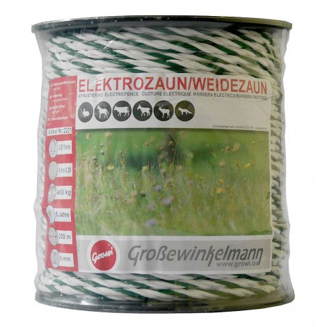 Growi® CraftLine Weidezaunseil mit Fasern aus Kunststoffmonofilen, dadurch besonders UV-stabil und hohe Zugfestigkeit, 6 starke Edelstahlleiter mit 0,4 mm Durchmesser sorgen für permanent hohe Spannung auf dem Zaun, Widerstand nur 1,2 Ohm/m, Farbe: weiß mit grünem Kennfaden, 200 m-Rolle.