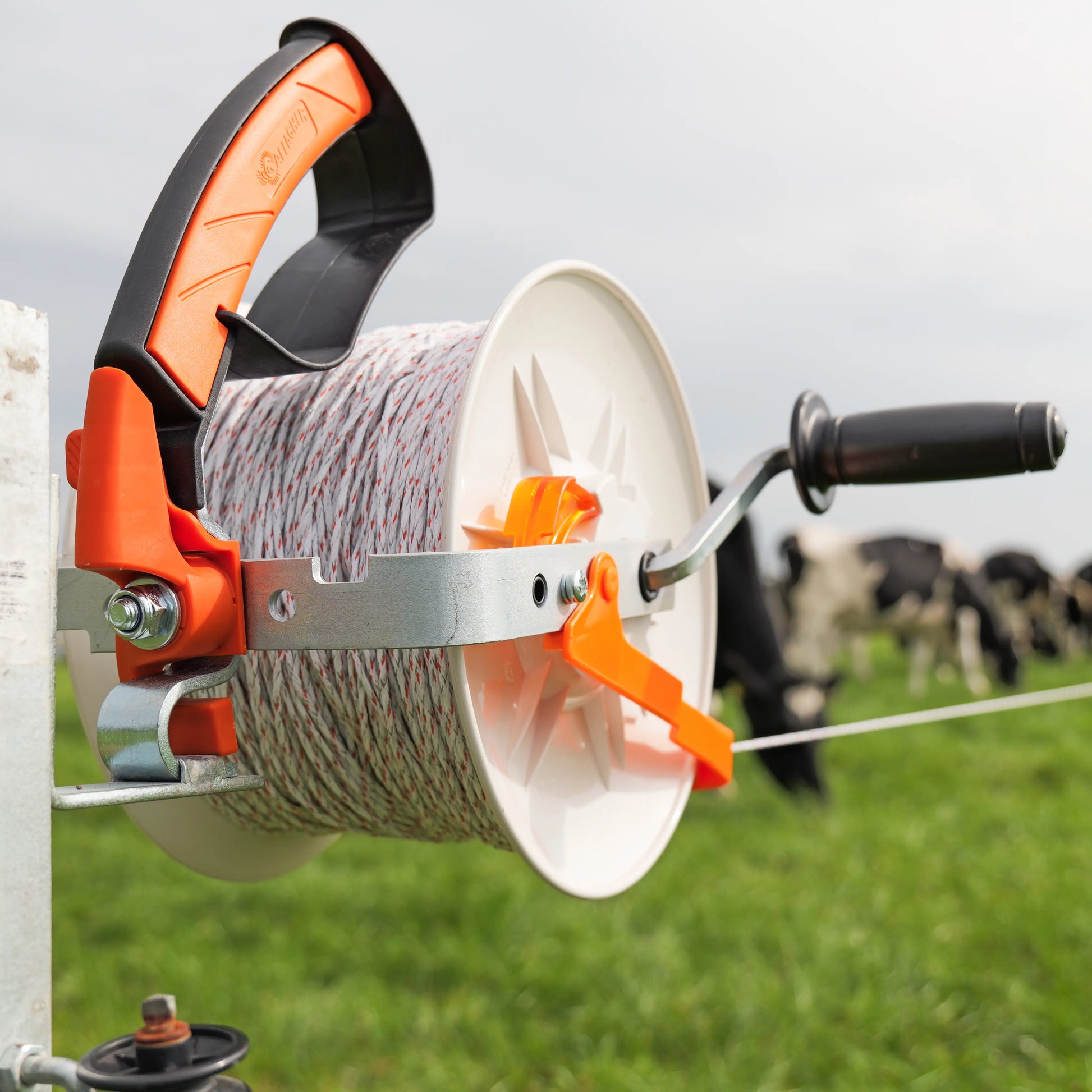 Die Haspel wird mit einem isolierten Griff aus haltbarem, UV-beständigem Kunststoff geliefert. Das Design des Hakens sorgt dafür, dass er nicht von der Litze abrutscht. Außerdem sorgt das Design dafür, dass der Griff leicht über die Wiese gleitet und nicht im (langen) Gras stecken bleibt.