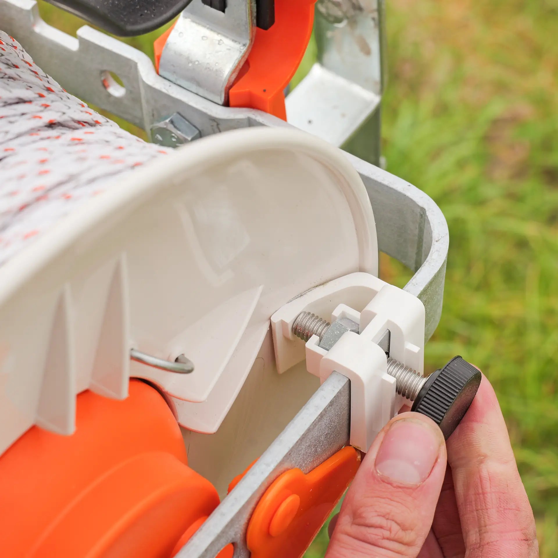 Die orangefarbene Spulenführung sorgt dafür, dass die Litze so eng und sauber wie möglich aufgewickelt werden kann. Außerdem verfügt diese Haspel über einen Verriegelungsmechanismus, auch Transporthaken genannt. So ist der Haken gesichert und kann nicht aus dem Aufhängebügel herausrutschen oder vom Quad herunterfallen.