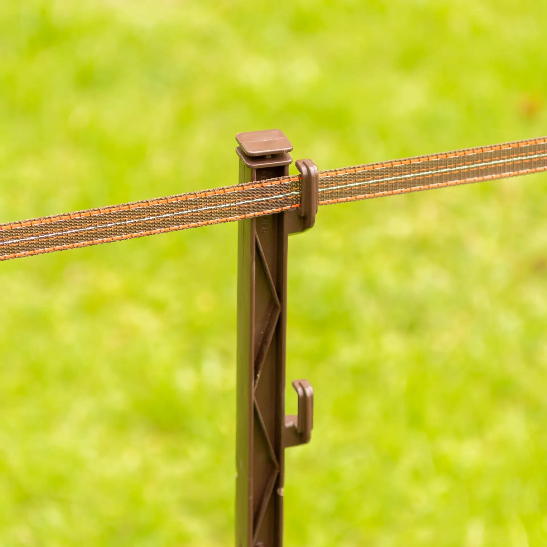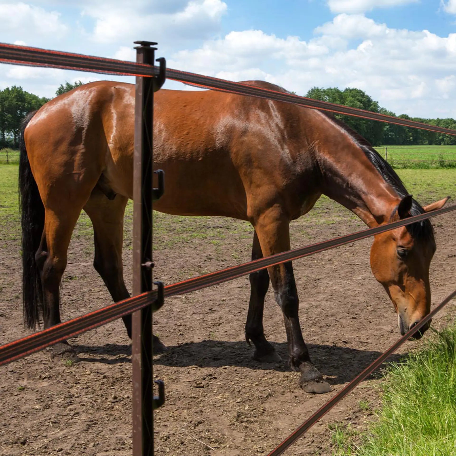 Terra Zaunband hat eine erdfarbene Ausstrahlung, die sich schön in die Landschaft einfügt und weniger in der Umgebung auffällt. Es ist ideal für diejenigen, die Funktionalität mit einem natürlichen, ruhigen Erscheinungsbild kombinieren möchten. Dank der breiten Form bleibt das Band auch in Terra-Ausführung für Tiere ausreichend sichtbar, ohne störend zu sein.
