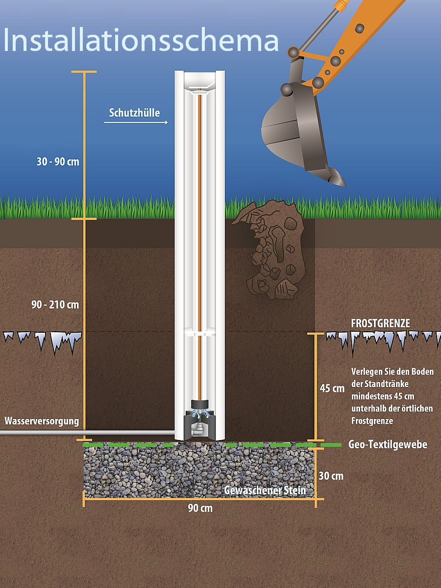 Jetzt neu im Programm: unsere innovative und frostsichere Standtränke ohne Strom. Selbst bei großer Kälte gibt es kein Zufrieren. Sie kann überall dort aufgestellt werden, wo es einen Wasseranschluss gibt, der einen haushaltsüblichen Wasserdruck von 1,75 bis 4,5 bar bereit hält.