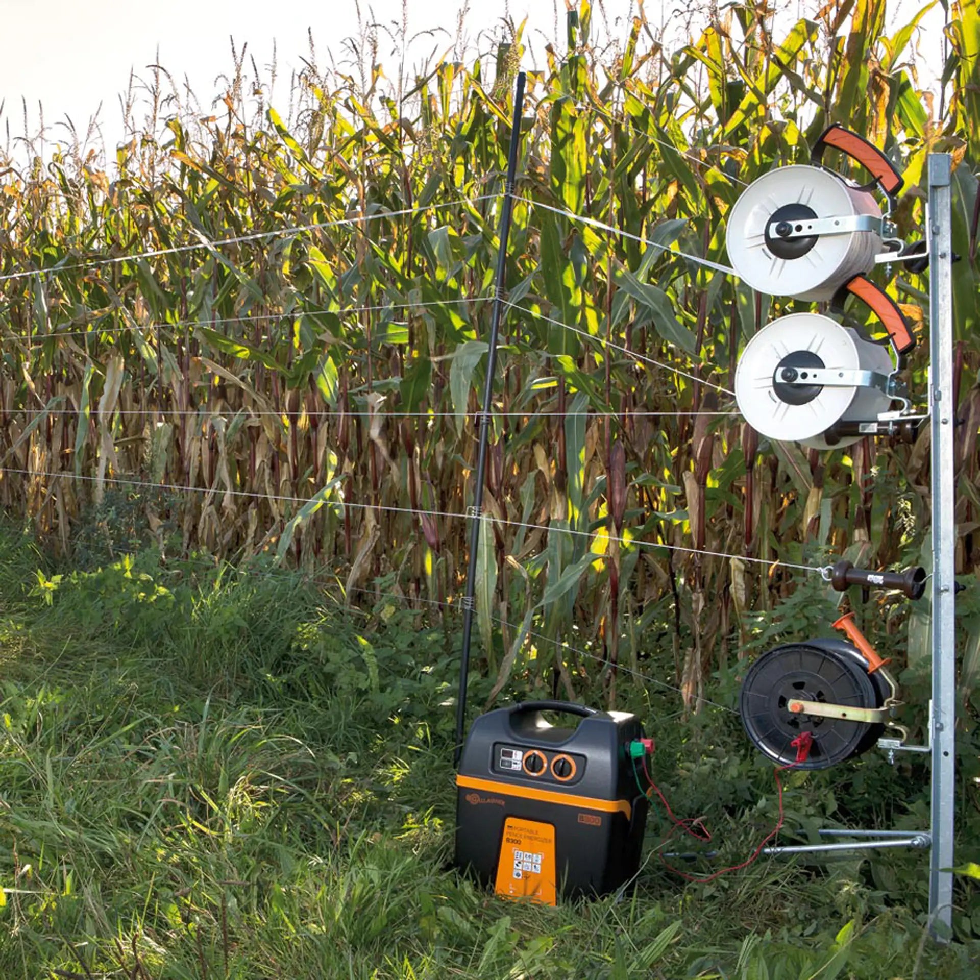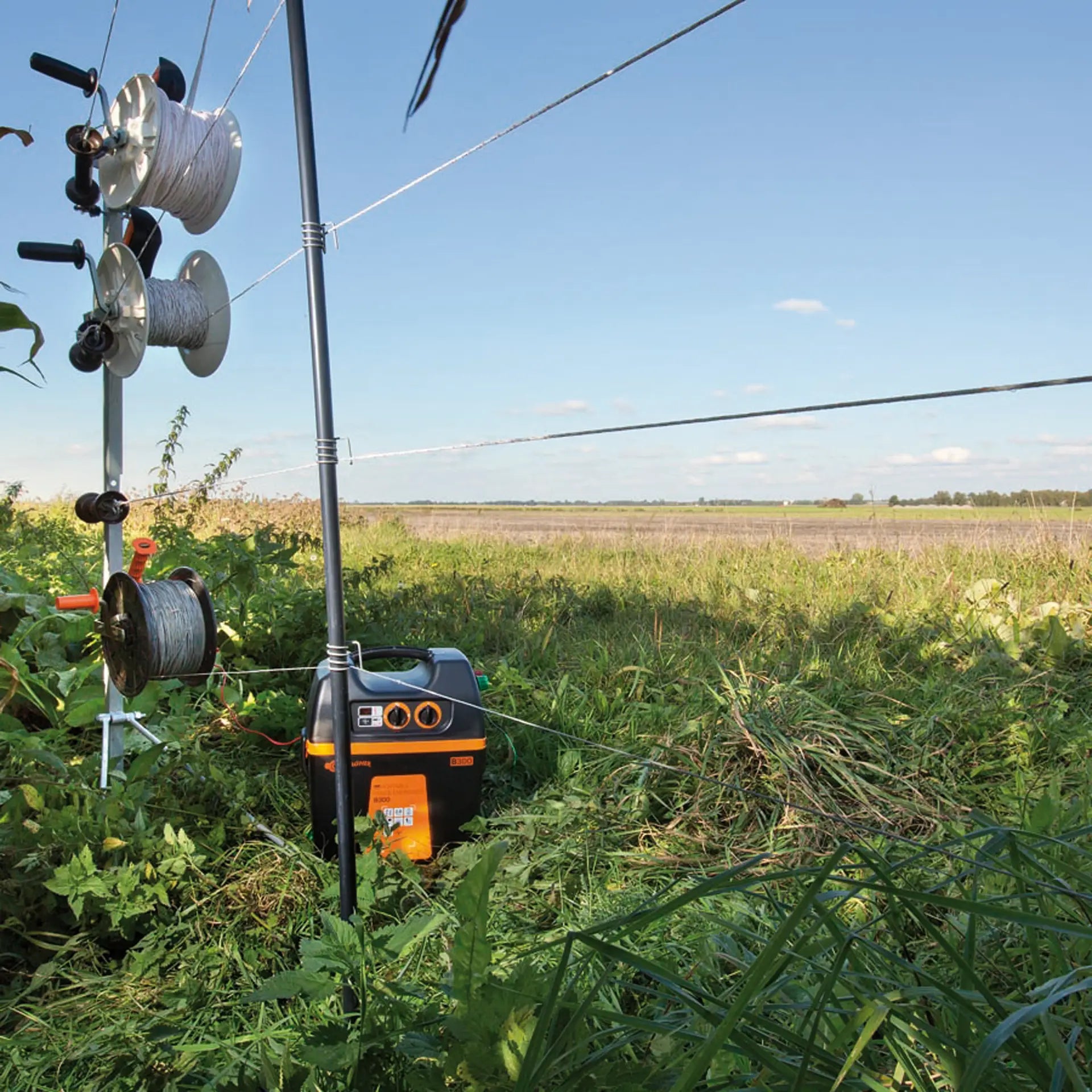 Das B300 von Gallagher ist ein tragbares Akku-Weidezaungerät für Pferde, Vieh und Wild. Mit einer Ladeenergie von 2,6 Joule (Impuls 2 J) und einer Ausgangsspannung von 10.000 Volt ist es unter optimalen Bedingungen stark genug für einen Zaun bis 30 km. Unter normalen Bedingungen kann es einen Zaun von 8 km mit Strom versorgen. Das Gerät befindet sich in einem robusten, wasserbeständigen und stoßfesten Gehäuse, in das auch der Akku oder die Batterie passt. Dies macht den B300 ideal für temporäre oder abgelegene Zäune, beispielsweise Wiesen ohne Stromversorgung oder mobile Zäune.