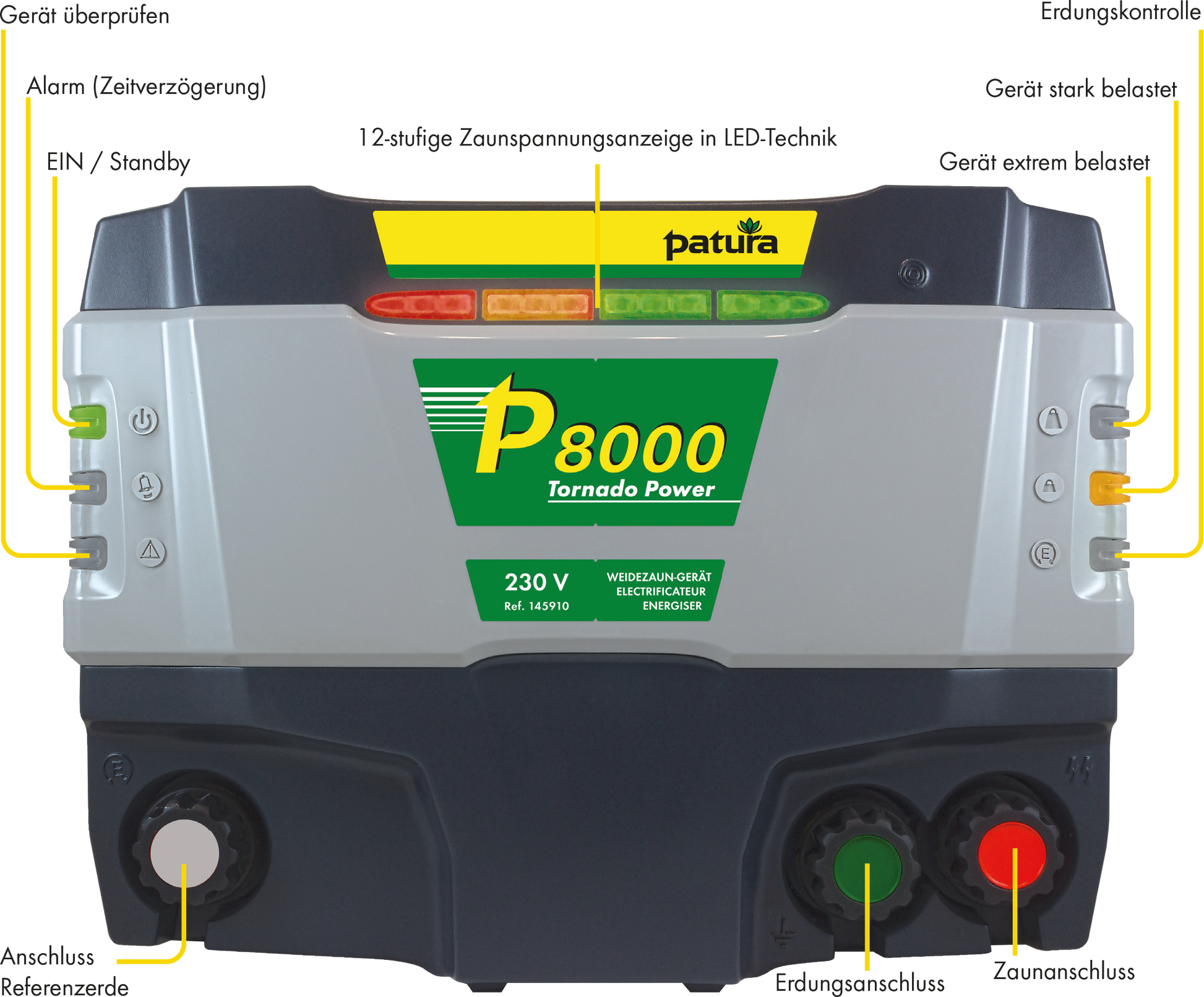 Mit 15 Joule Impulsenergie höhere Spannungen erzielen als das Vorgängermodell mit 37 Joule: mit dem PATURA P 8000 Tornado Power ist dies möglich. Das besondere, neuartige Netzteil zur Stromversorgung sorgt für die nötige Isolierung zwischen Stromnetz und Zaun. Dank dieser patentierten Technologie werden selbst unter außergewöhnlichen Belastungen höchste Spannungen erreicht, so dass das Gerät ideal zur Verwendung bei extremen Zaunlängen oder großen Herdenschutzzäunen geeignet ist. Die Leistungsfähigkeit der Erdung lässt sich mittels Referenz-Erdungsanschluss problemlos überprüfen, Fehler in der Erdung werden gut sichtbar an der entsprechenden Kontrollleuchte angezeigt. Dank der Isolierung zwischen Zaun und Stromnetz ist dieses deutlich besser vor Blitzeinschlägen in den Zaun geschützt.