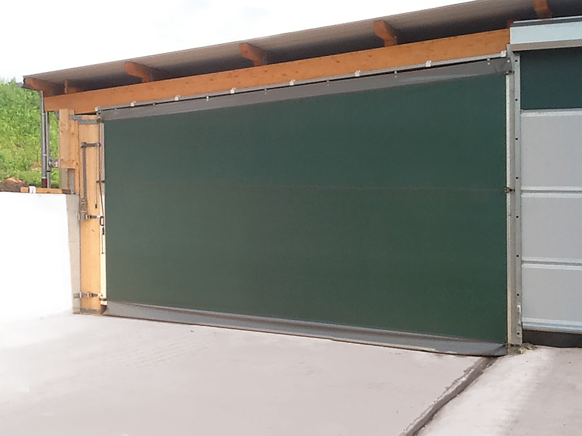 Für Tore mit einer Breite von über 6,00 m sind Windschutz-Zugrollos und Windschutz-Rolltore nicht mehr hinreichend windsicher. Für diesen Einsatzbereich wurde der Windschutz-Vorhang entwickelt. Der gesamte Vorhang gleitet auf massiven Rollen in einer Laufschiene und wird zusätzlich mit eingeschweißten Spanngurten stabilisiert. Geeignet bis Windgeschwindigkeiten von max. 88 km / h.