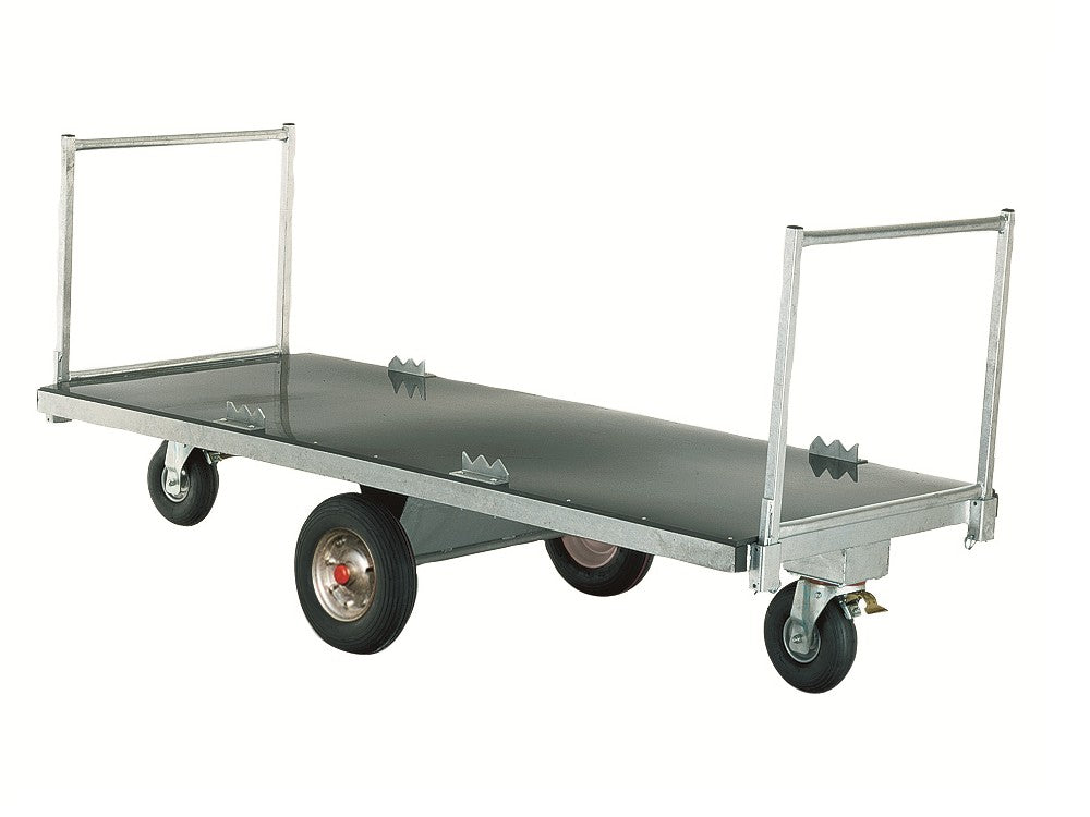Trotz seiner Gesamtlänge von 2500 mm und der Gesamtbreite von 1400 mm ist der Quader-Jumbo, durch die Anordnung der Lenkrollen äusserst wendig. Die Räder und Lenkrollen sind rollenkorbgelagert und somit leicht zu bewegen. Der Quaderballen wird durch 4 Zackenleisten auf dem Wagen festgehalten. Komplett feuerverzinkt, verstärkte Bereifung. Eigengewicht: ca. 110 kg, Gesamtlänge: ca. 2500 mm.