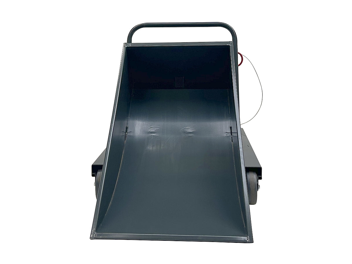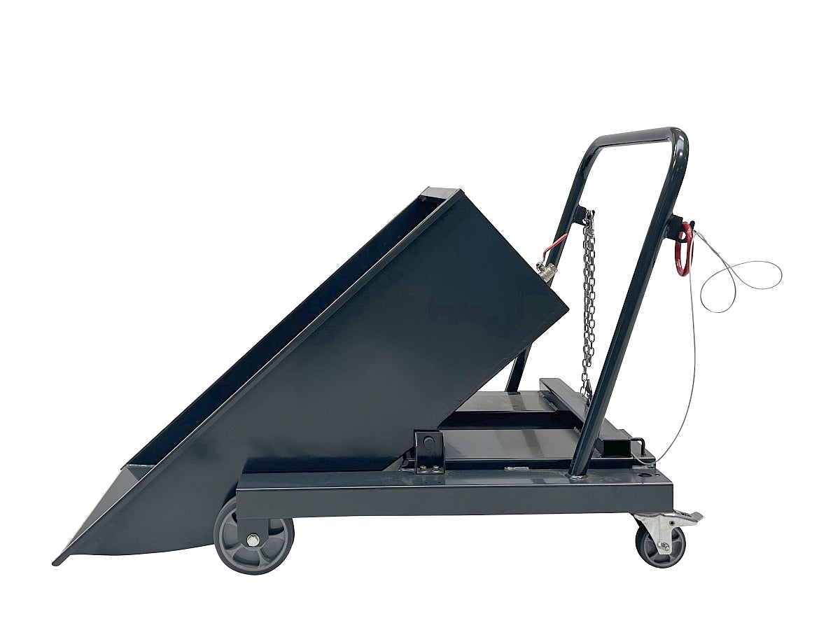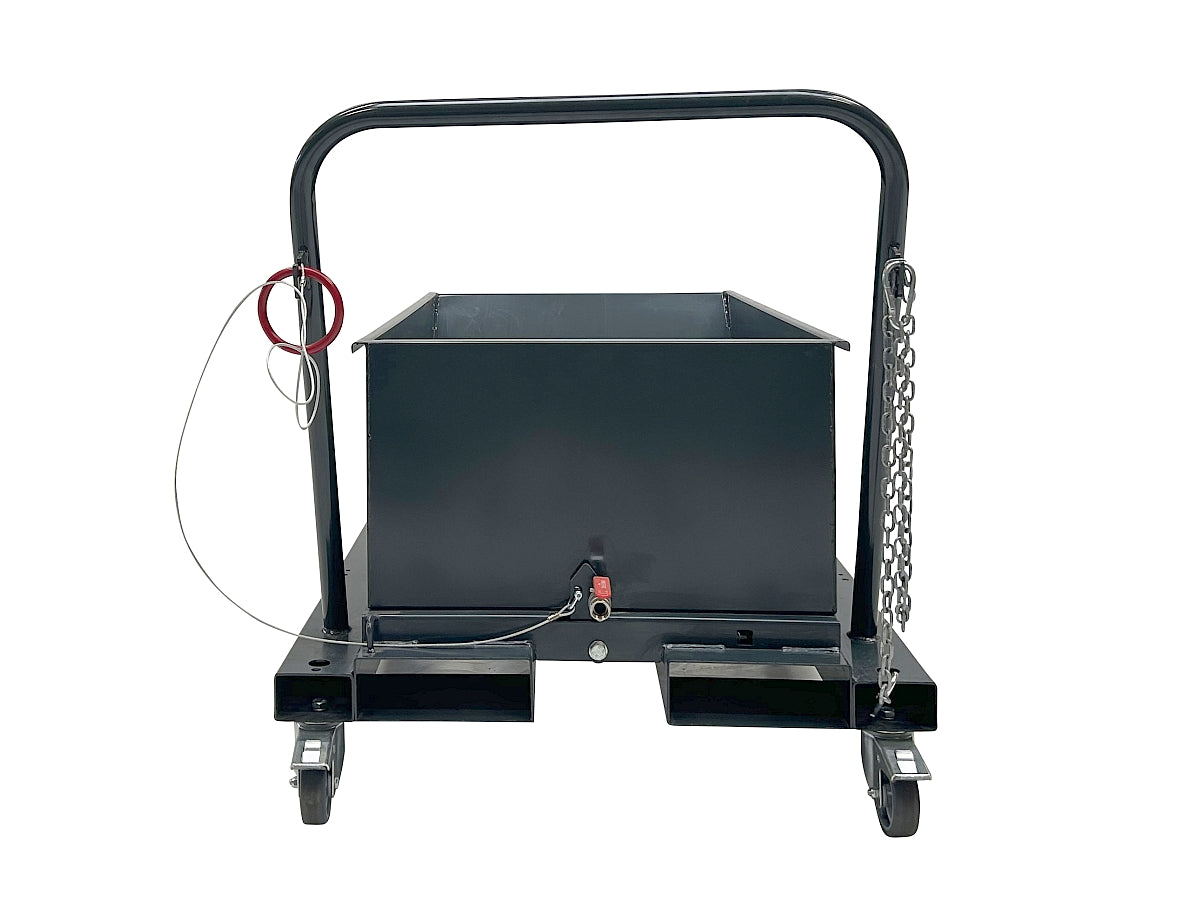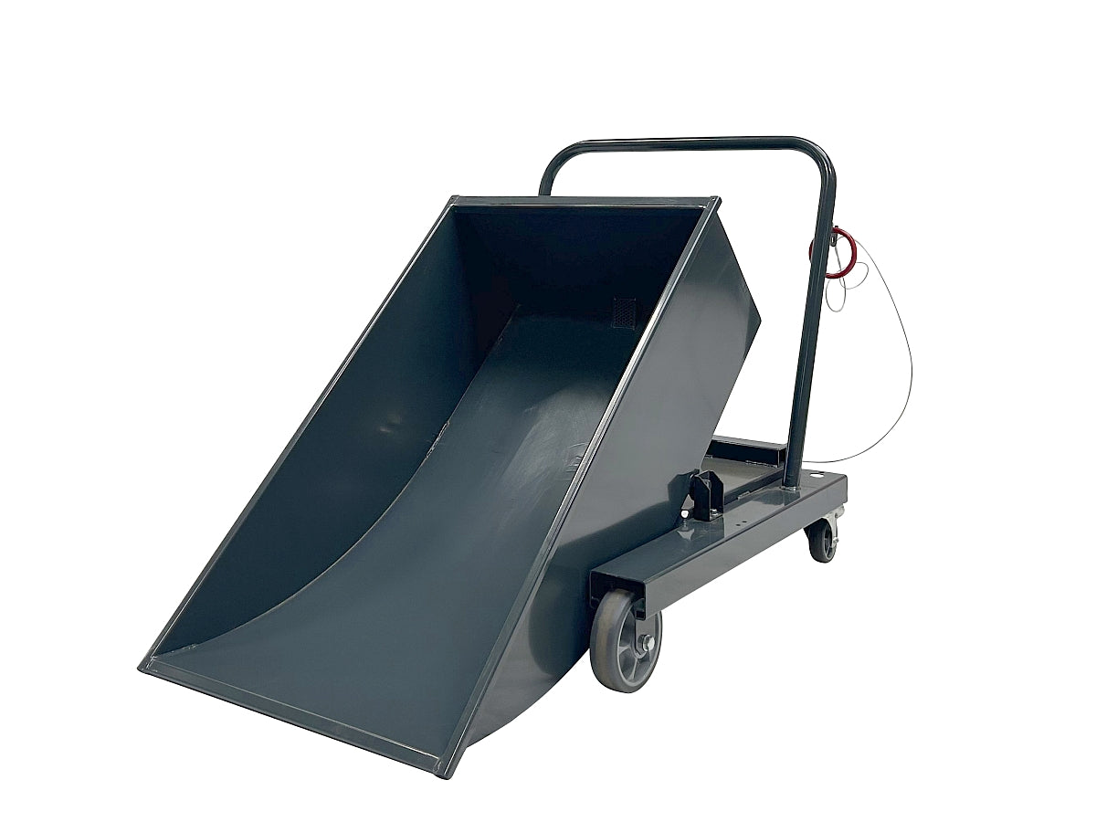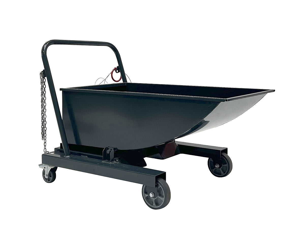 Späne-Kippbehälter Typ SKR mit Kippgestell und Staplertaschen, robuste wasserdichte, verschweißte Mulde, gekanteter Wannenrand. Das kantenlose, leicht geschwungene Bodenblech wirkt als ideale Rutschfläche für schnelles, rückstandsloses Auskippen.