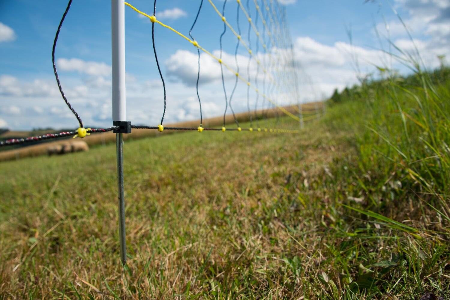 4. Sicherheit und Sichtbarkeit: Die gelben Litzen und weißen Pfähle sorgen dafür, dass das horinetz high energy auch in der Dämmerung gut erkennbar ist. Stabile und abgerundete Plomben an den Maschenkreuzungspunkten sowie robuste Edelstahlklammern ermöglichen ein einfaches Verbinden von Netz zu Netz ohne zusätzliches Werkzeug.