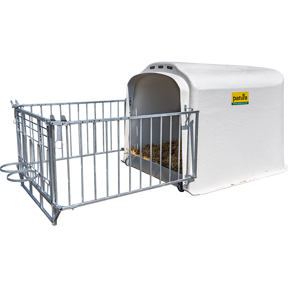 Als Erweiterung für die Kälberhütte kann an alle Varianten der PATURA Kälberhütten eine Umzäunung angebaut werden. Diese Umzäunung verfügt je nach Ausführung über zwei seitliche Abtrennungen inklusive Zugangstür sowie einem Fressgitter mit mindestens 5 Fressplätzen, an dem ein Futtertrog sowie ein Nuckeleimer-Montagesatz angebaut werden kann. Weiteres Zubehör wie beispielsweise eine Heuraufe oder Futterschalen können problemlos an der Umzäunung angebracht werden.