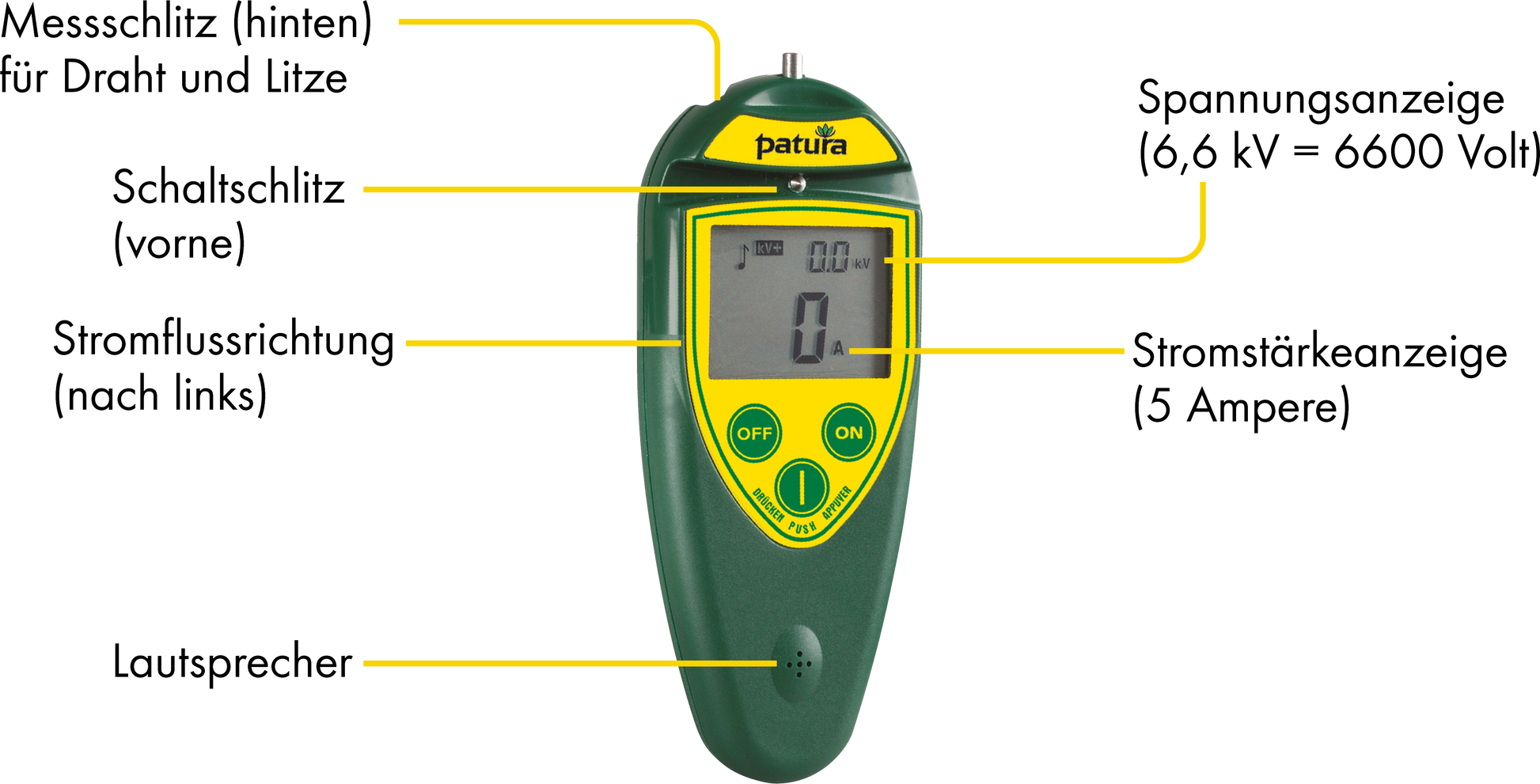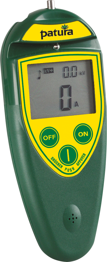 Zur Fehlersuche wird die PATURA Fernbedienung auf den Zaundraht gedrückt und zeigt Spannung, Stromstärke und Stromflussrichtung (mittels Pfeil) an. Auf diese Weise lässt sich ein Kurzschluss schnell finden. Nach der Fehlerstelle geht die Stromstärke gegen 0 und der Richtungspfeil verschwindet.