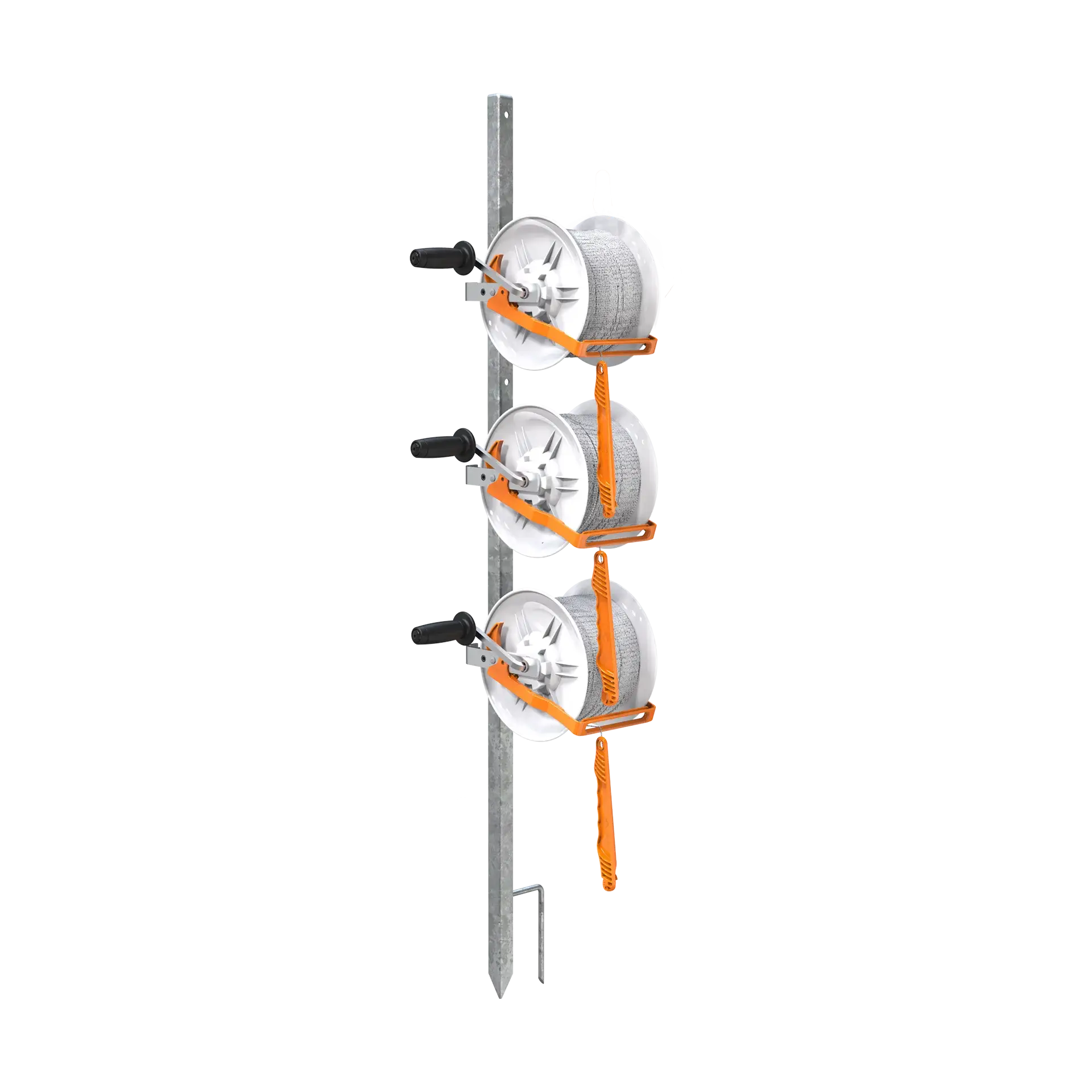 Das Produkt für die vorübergehende Einzäunung bzw. Portionsbeweidung. An diesem Haspeleckpfahl sind drei Haspeln mit Übersetzungsmechanismus und 400m Vidoflex Kunststoffdraht angebracht. Damit können Sie schnell und einfach einen Teil der Weide abtrennen. Die Höhe des Haspeleckpfahls beträgt 1,07m.