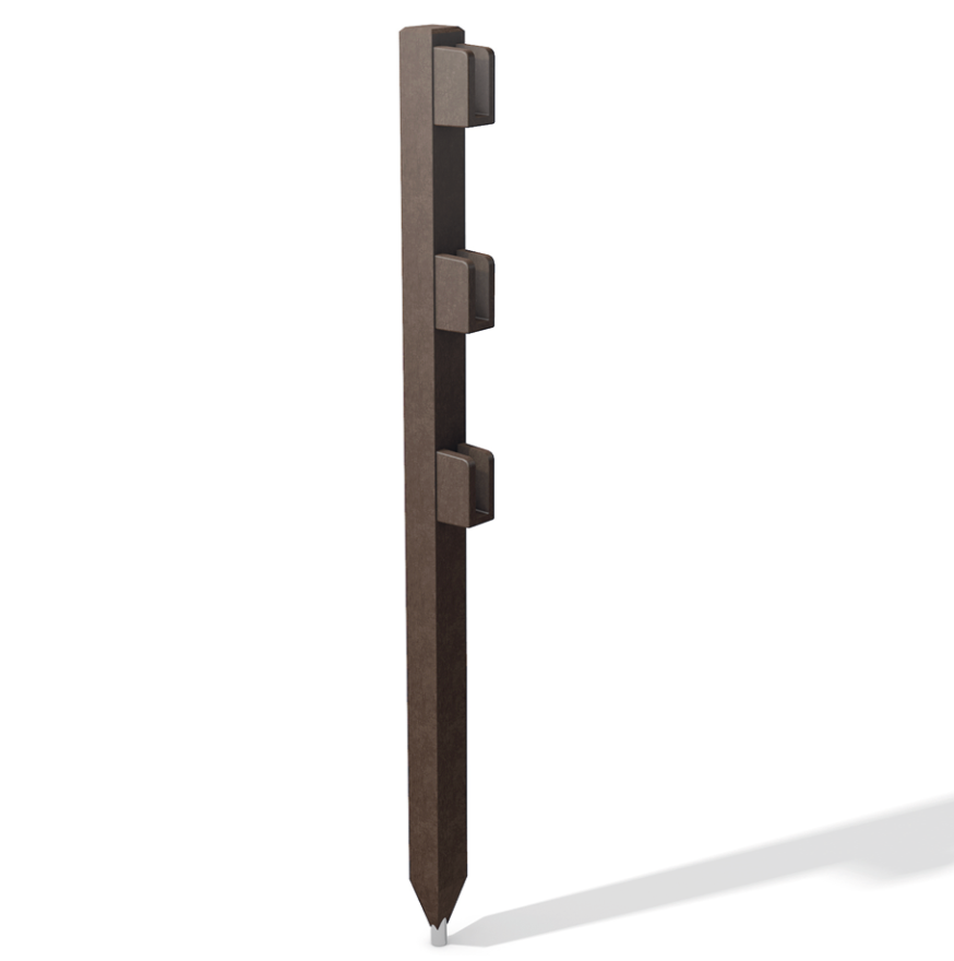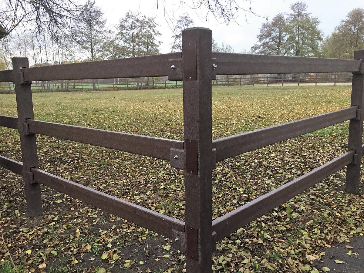 Bei dem Koppelzaunsystem Karja, in klassischer Farmoptik, werden die Querriegel einfach in die Aussparungen der Pfosten gelegt. Durch das Arretieren mit jeweils einer Schraube werden die Riegel gehalten. Die Pfosten sind aus strapazierfähigem und langlebigem Recycling-Kunststoff produziert und mit einem zusätzlichen Eisenkern verstärkt. Ein Zaun der „Zähne“ zeigt, denn die Ecken und Richtungswechsel werden durch die Montage von Koppelecken realisiert.